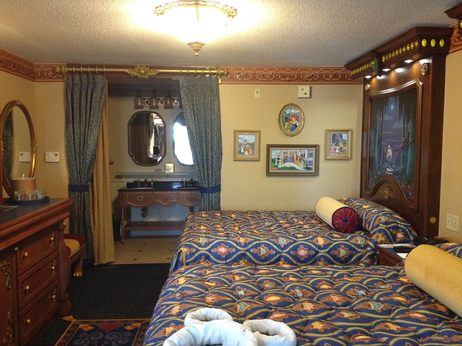 Each room is fit for royalty. Magnificent touches and magical surprises, including custom drapes and linens, ornately decorated beds— and headboards that glitter with fiber optic lights, creating your own personal “fireworks” display.